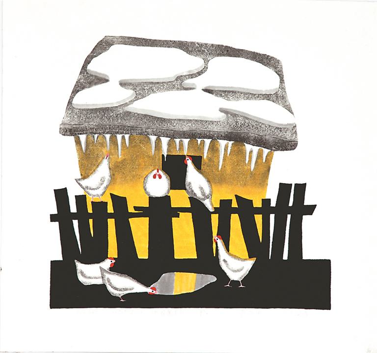 母爱是一个亘古不变的主题,这博大的爱沉浸在万物之中,充盈于天地之间。蒙希平的水印版画经常通过禽鸟幼雏的守护依偎,展现母爱的深沉与家庭的温暖。这种情感寄托不仅仅是对童年回忆的表达,更是对人类情感本质的探索。《孩子妈妈》创作于1982年,被中国美术馆收藏,当时蒙希平只有19岁,但已经能够驾轻就熟、利落老道。黑白灰为主的色调体现出中国传统写意画笔触墨韵的空灵意境;左右对称的构图产生了平衡稳定之感;竖向的板杖木门与横向的柈子垛形成了独特的视觉冲击力。也许是孩子们淘气跑远了,离开了妈妈的视线;也许是妈妈发现了好吃的食物,呼唤孩子们前来觅食;芦花母鸡飞身居于板杖门之上,咕咕咕地呼唤着她的孩子们。毛茸茸的小鸡雏听到妈妈的声音,扭动着圆滚滚的身子叽叽喳喳地汇集过来,稚嫩的黄色、橙色的小嘴儿和小爪子使小鸡雏可爱的形象呼之欲出。俯身向下的鸡妈妈与伸着小脖子仰望的鸡宝宝们上下呼应、动静结合,情趣盎然。画面上方的母鸡象征着“三春晖”的母爱如同阳光一样温暖明媚,孩子们在母亲的庇护之下健康茁壮地成长。“鸡”与“吉”谐音;鸡妈妈与九只小鸡雏又有着“十全十美”寓意,蒙希平以自己的方式解读着中国传统文化,并活用于自己的版画创作,形成了兼具视觉冲击力与文化厚重感的独特风格。《东北小笨鸡》《暮归》等作品中鸡的形象同样喜庆祥和,并运用了数字意象寓意着北大荒垦区生活的幸福美满。